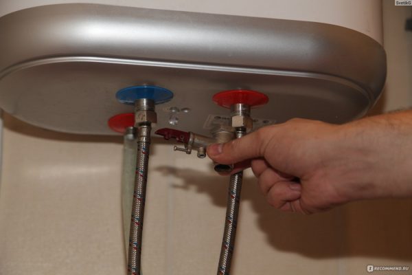 Importante! Su alcuni scaldabagni, è installata una valvola di sicurezza, sulla quale non è presente una bandiera speciale. In questo caso, procedere come segue: trovare la molla all'interno della valvola, che deve essere premuta usando il tubo. Non svitare mai la valvola di sicurezza.