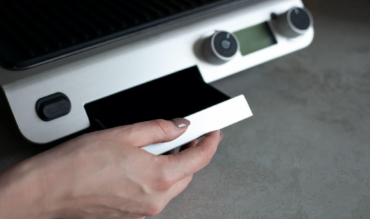 Il grasso fuso durante la cottura fuoriesce in un apposito vassoio situato nella parte inferiore del dispositivo. È possibile accedervi dal lato anteriore: nello stato chiuso il vassoio è allineato al piano anteriore della griglia. Dopo la cottura, rimuoverlo e lavarlo in acqua, quindi riposizionarlo.