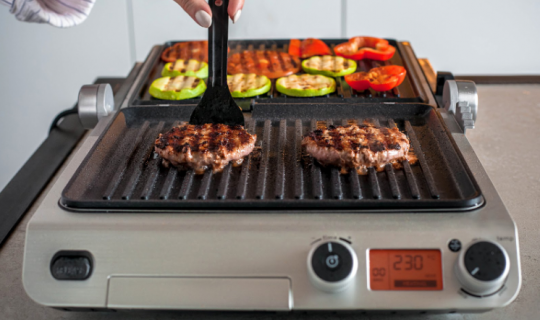 Se vuoi cucinare più carne o verdure di quelle che si adattano al pannello inferiore, la modalità BBQ verrà in soccorso. In esso, la griglia è disposta come un libro, formando 2 ripiani. In particolare, puoi friggere le bistecche a metà e cuocere un contorno di verdure nell'altra.
