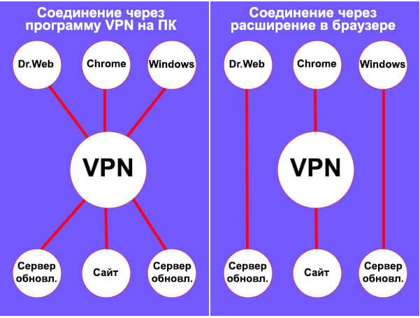 Le principe de fonctionnement de divers programmes et tâches du système d'exploitation lors de l'utilisation d'un VPN installé dans le système et d'un VPN installé comme extension pour le navigateur