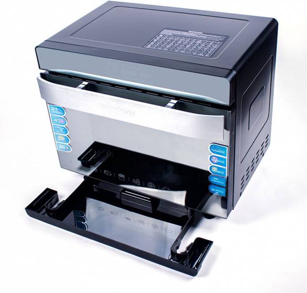 Sunulan segmentteki en büyük fırınlardan biri. 65 litre iç hacme sahiptir. Kolayca tam bir fırının yerini alacak. Buz çözme ve konveksiyon da dahil olmak üzere gerekli tüm modlar vardır. Mekanik kontrol, küçük bir sıcaklık adımı ile sağlanır. Gerekli bilgiler ekranda görülebilir.